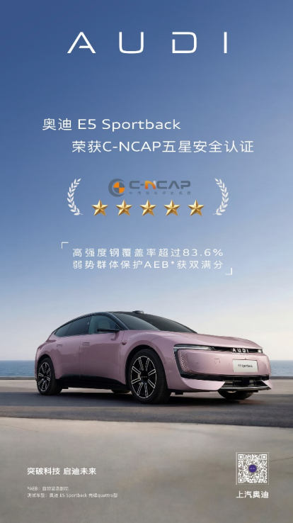2026年3月27日,上海 –近日,中汽中心汽车测评管理中心正式发布2026年度最新一批《中国新车评价规程(C-NCAP)》车型测评结果。奥迪 E5 Sportback凭借全面领先的整车安全架构与极致全域防护性能,以91.3%的综合得分率,荣获C-NCAP最高等级五星安全认证,充分彰显了其在豪华纯电市场标杆级的安全硬实力,更印证了奥迪的百年造车底蕴。